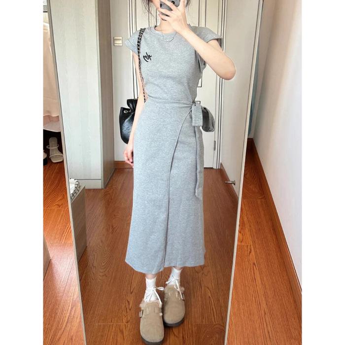2025 Французский серый Платье миди с завязкой на талии и короткими рукавами - Женский летний стиль XXL