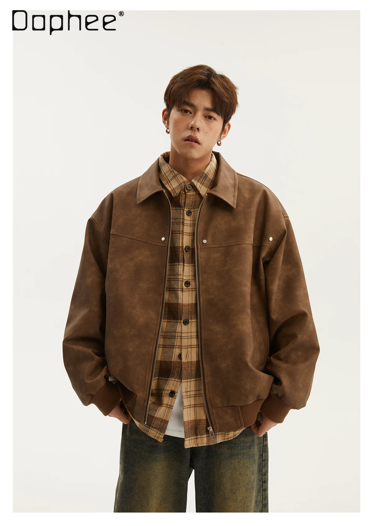 2025 весенне-осенняя американская ретро-отложная куртка с отложным воротником, черная, коричневая кожаная куртка, мужская повседневная свободная рабочая одежда, розовая, синяя куртка
