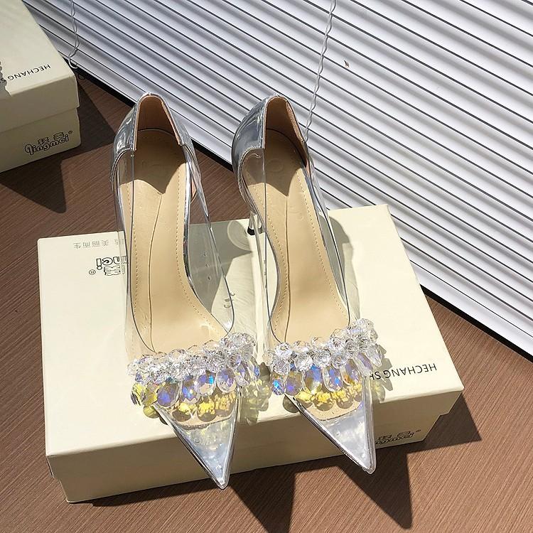 2025 весна и осень новая корейская версия мода прозрачные туфли на высоком каблуке женские тонкие каблуки острый носок стразы шампанское одинарные туфли женские 40 серебряный