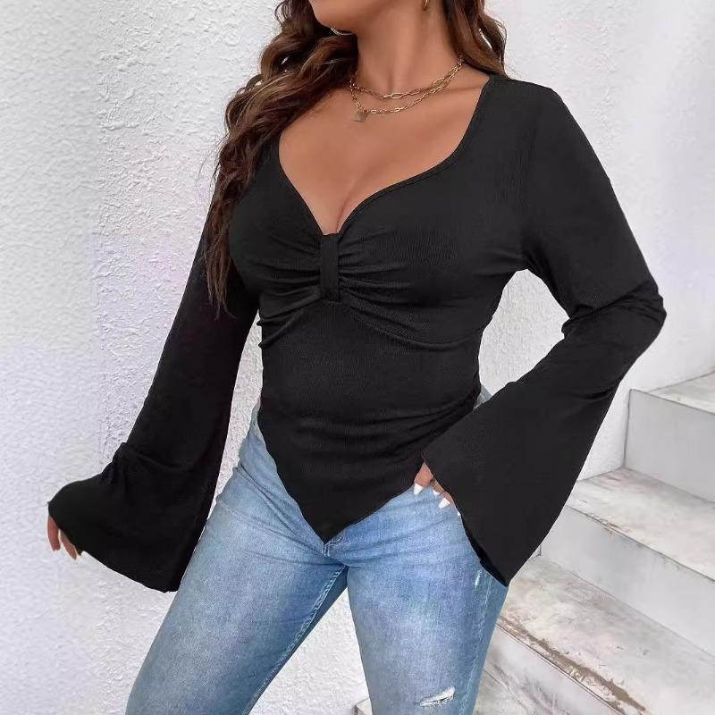 2025 весна осень расклешенная длинная рукава асимметричная женская блузка больших размеров облегающая футболка с V-образным вырезом повседневная простая черная рубашка топ женская одежда XXXXL чёрный