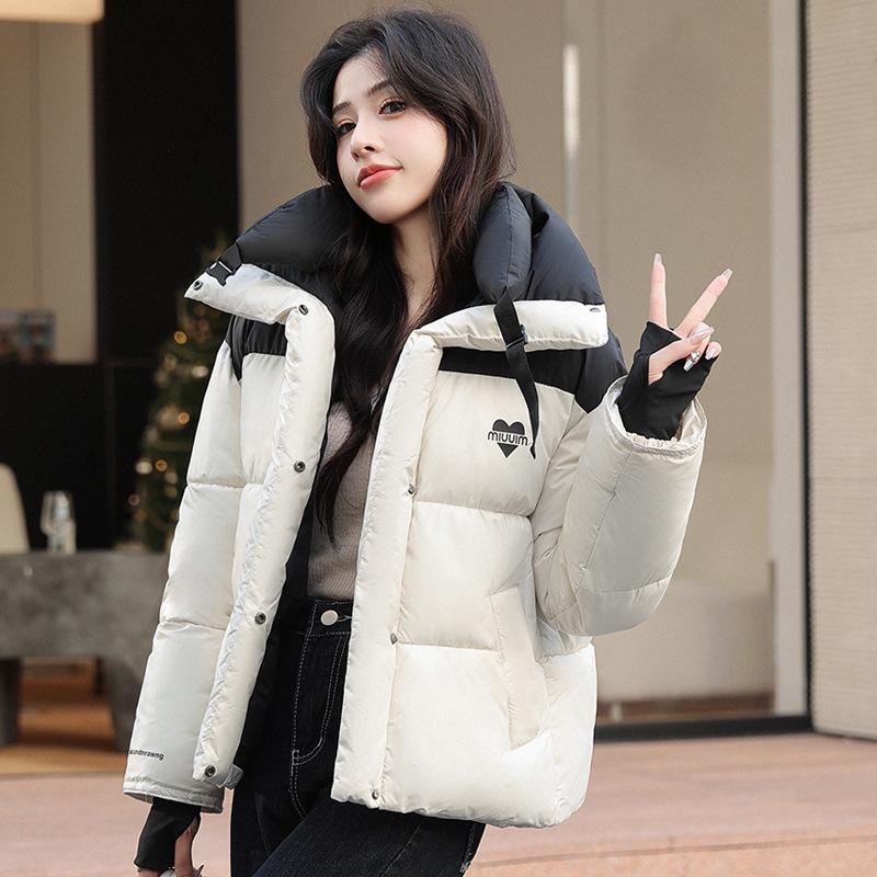2025 зима новая пуховая хлопковая куртка женская короткая стойка воротник утолщенная свободная лоскутная контрастная куртка-пуховик M белый