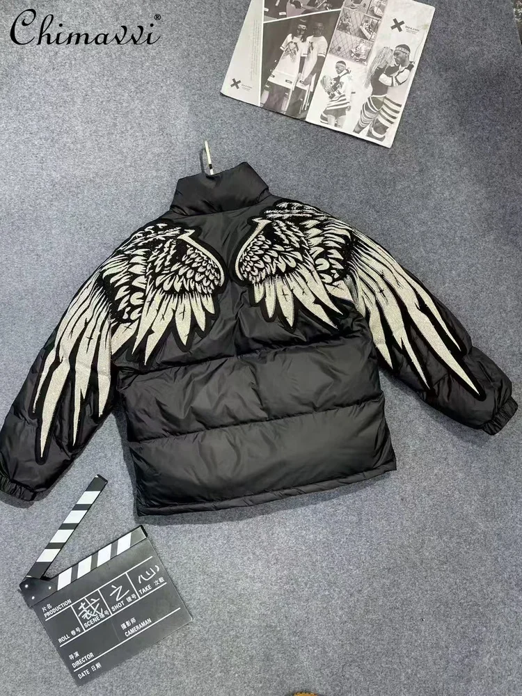 2025 зимняя новая тяжелая промышленность со стразами и крыльями, черная хлопковая куртка с надписью, мужская модная уличная одежда, свободное теплое пальто большого размера