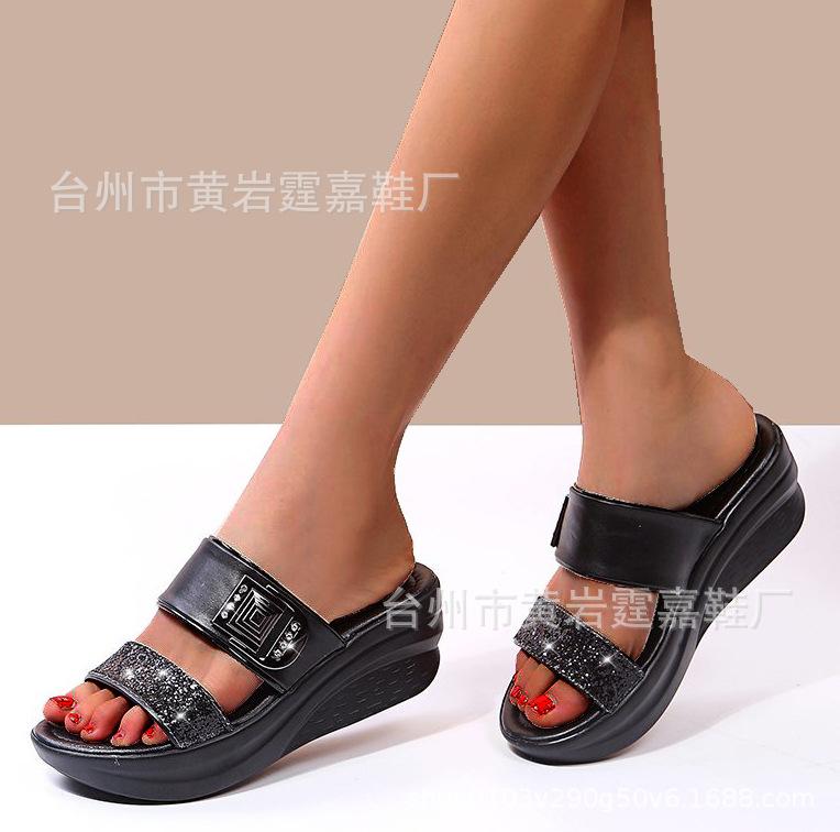 2025 летние новые босоножки женские модные туфли на танкетке со стразами и пайетками большого размера с эффектом рыбьего рта 35 чёрный