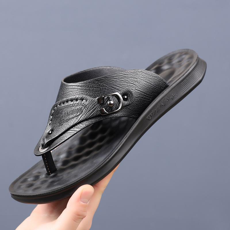 2025 летние шлепанцы мужские нескользящие для отдыха на открытом воздухе пляжные классные тапочки мягкая подошва кожаные классные тапочки 8571 38 чёрный
