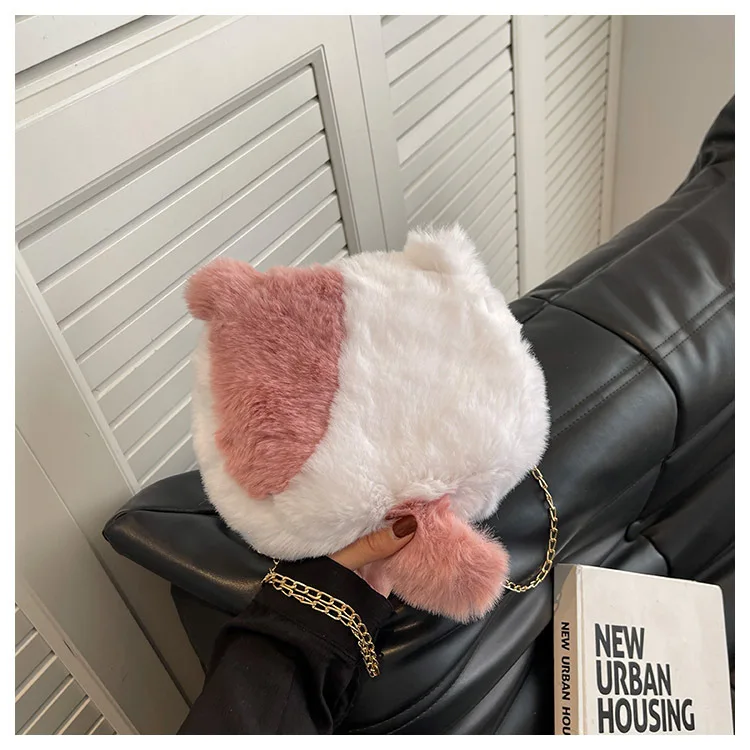 2025 милая пушистая сумка с мультяшным лицом для девочек, зимняя сумка через плечо с цепочкой, кавайный плюшевый кошелек, стильный мини-рюкзак