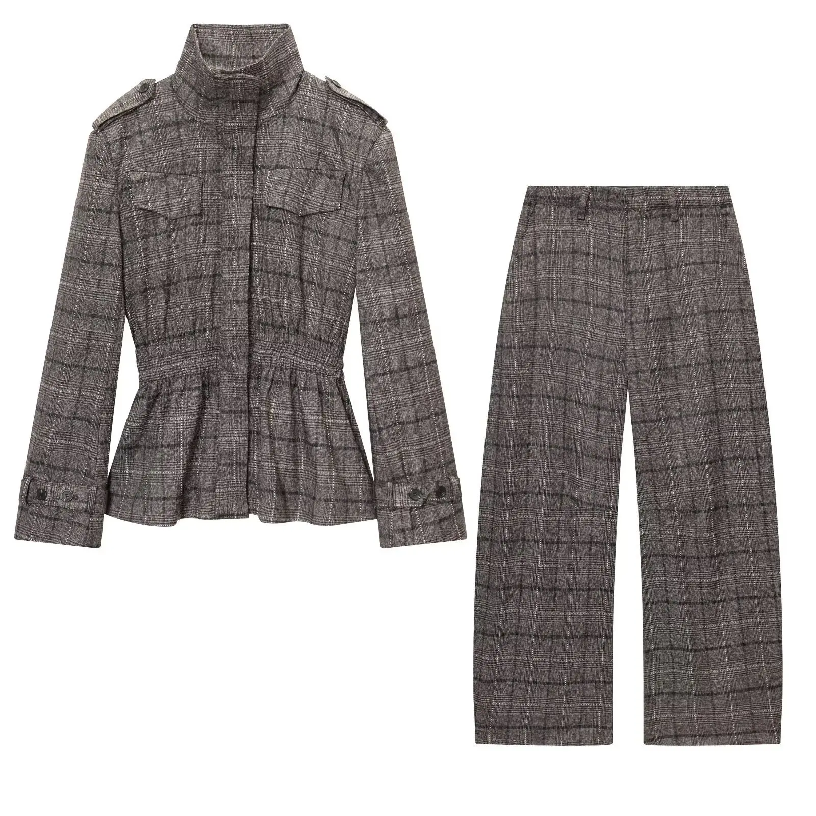 2025 модное ретро клетчатое пальто с рюшами и подолом, комплект брюк, воротник-стойка, пиджак с длинными рукавами + брюки, комплект из 2 предметов