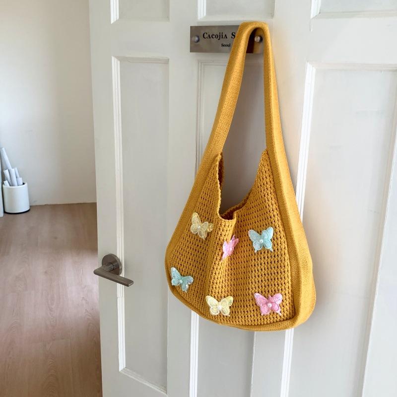 2025 новая высококачественная вязаная сумка с ажурным узором, простая наплечная сумка, вязаная сумка с элементом банта жёлтый