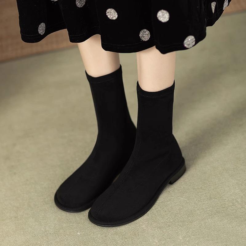 2025 новая осенне-зимняя замшевая тонкая обувь с круглым носком, средней высоты голенища, на низком каблуке, эластичные тонкие ботинки, с круглым носком, на плоской подошве, с рукавом, короткие ботинки женские 39 чёрный