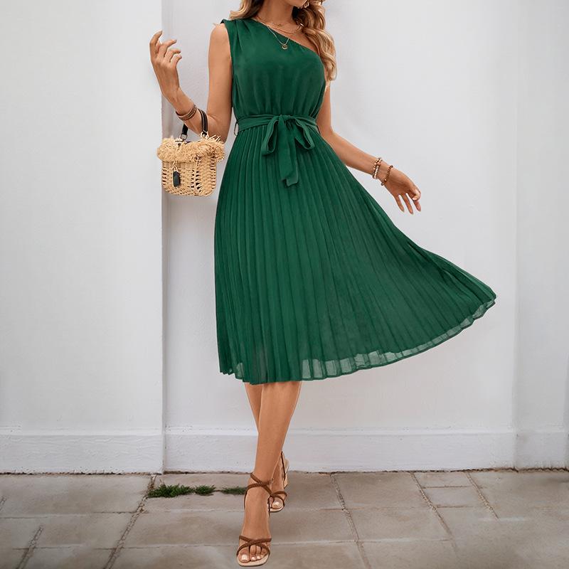2025 новая элегантная плиссированная юбка персонализированное асимметричное платье с открытым плечом однотонное на одно плечо S темно-зеленого