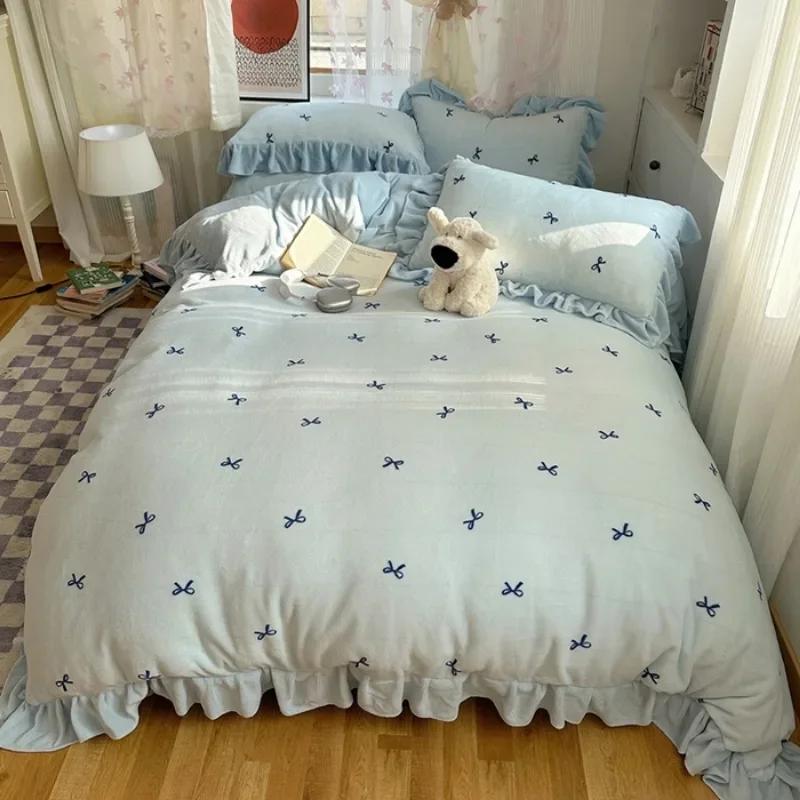 2025 новый корейский комплект из четырех предметов с бантом и кружевом из молочного флиса, коралловый флис, зимнее утолщенное постельное белье 1.8m sheet 4pcs небесно-голубой