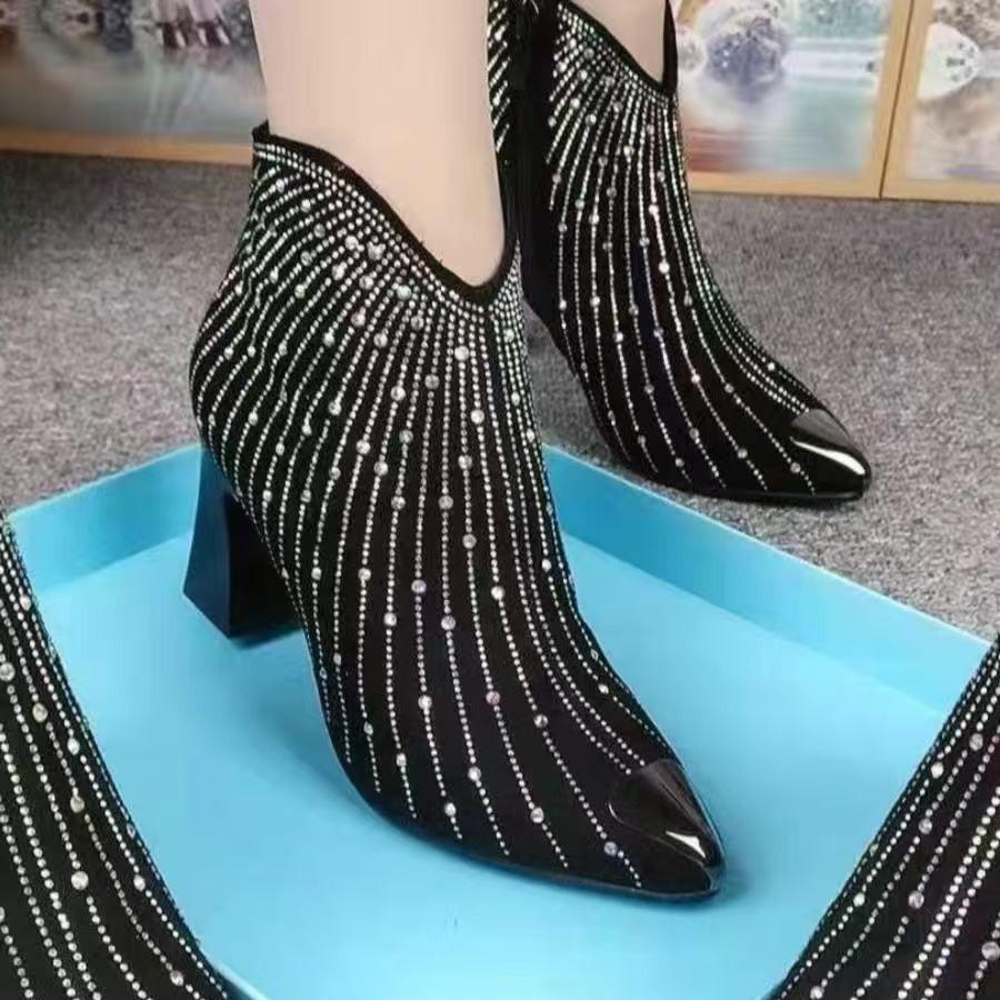 2025 осень и зима новая мягкая кожа стразы ботильоны бархат острый носок хрустальные высокие каблуки толстый каблук модные универсальные модные ботинки 40 чёрный