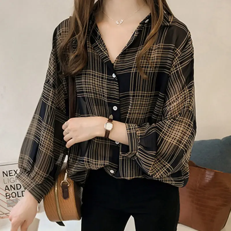 2025 офисная женская универсальная женская блузка большого размера с лацканами, модная повседневная тонкая шифоновая свободная клетчатая женская рубашка с рукавами «летучая мышь»