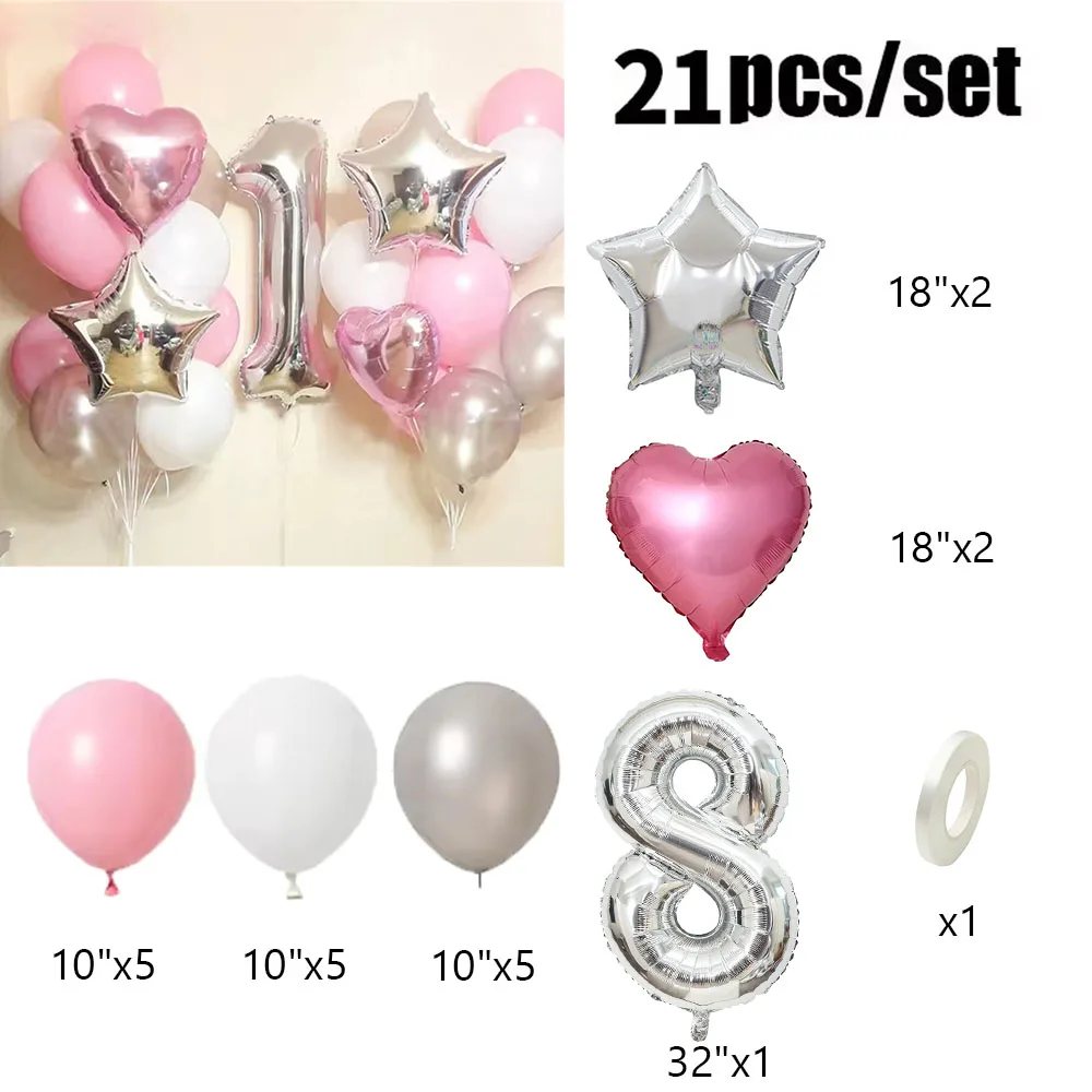21 шт. розовые, серебряные воздушные шары из фольги с номером и сердечком, украшение для вечеринки в честь первого дня рождения, детские товары для девочек 1 2 3 4 5 6 7 8 9 лет