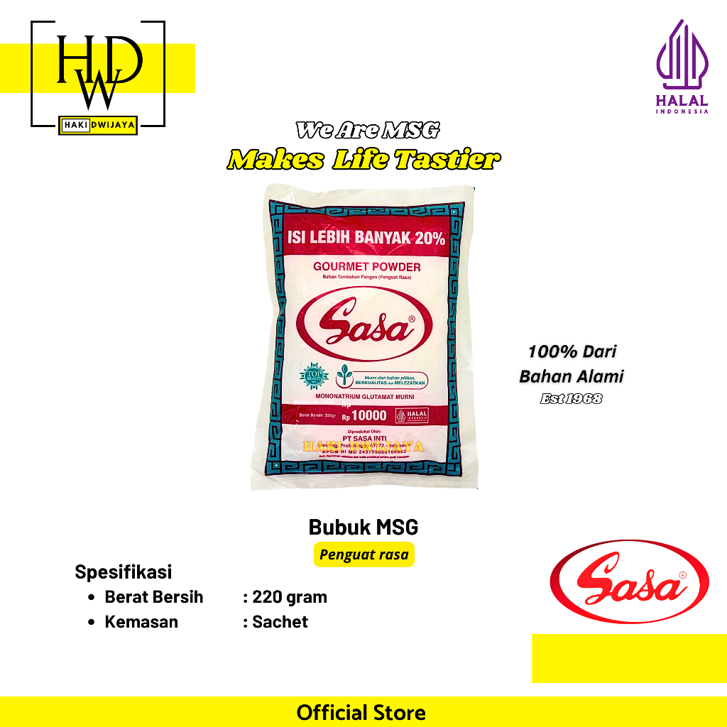 Sasa MSG 220gr adalah penyedap rasa Monosodium Glutamat (MSG) murni berkualitas tinggi yang diformulasikan untuk memperkaya cita rasa masakan. Diproduksi oleh PT Sasa Inti, produk ini telah menjadi andalan di dapur rumah tangga dan industri kuliner Indonesia selama bertahun-tahun karena kemampuannya memberikan rasa gurih (umami) yang alami dan menyatu dengan berbagai jenis hidangan.