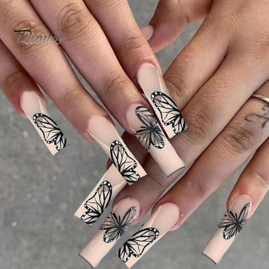 24 шт. балетный пресс на ногтях с клеем, черные бабочки с принтом, длинное наращивание ногтей, полное покрытие для женщин и девочек, пластиковые накладные ногти для салона домашнего использования