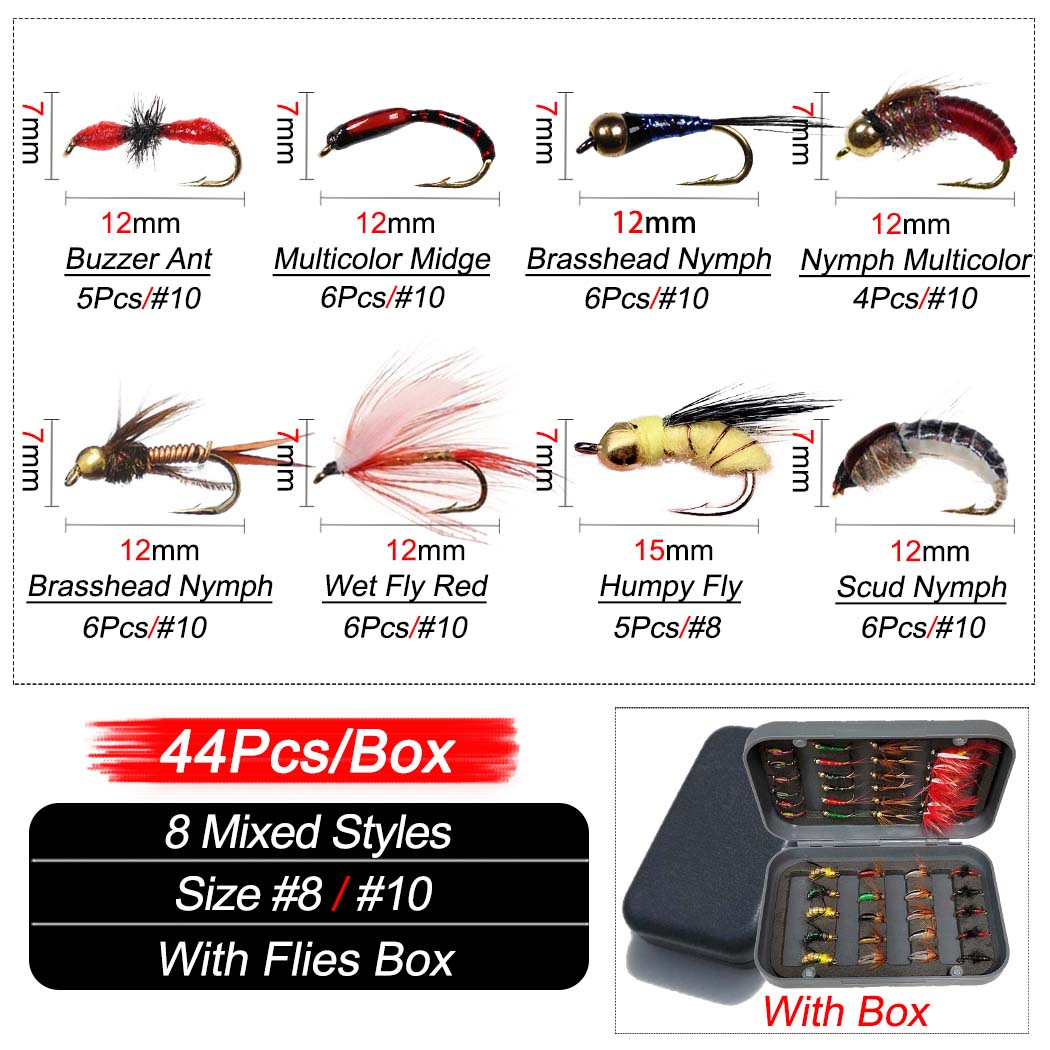 24-120 шт. набор мушек для рыбалки нахлыстом, сухие влажные мухи, рыболовная приманка, искусственная наживка для нимфы, форели, окуня, синяя жаберная муха, комбинированная приманка 44Pcs/Box(8 Mixed Styles)
