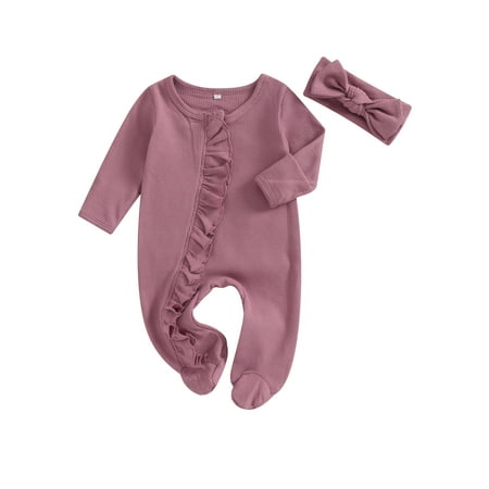 Bmnmsl Infant Girl Footies Rompers Solid Color Frills Bodysuits with Headband