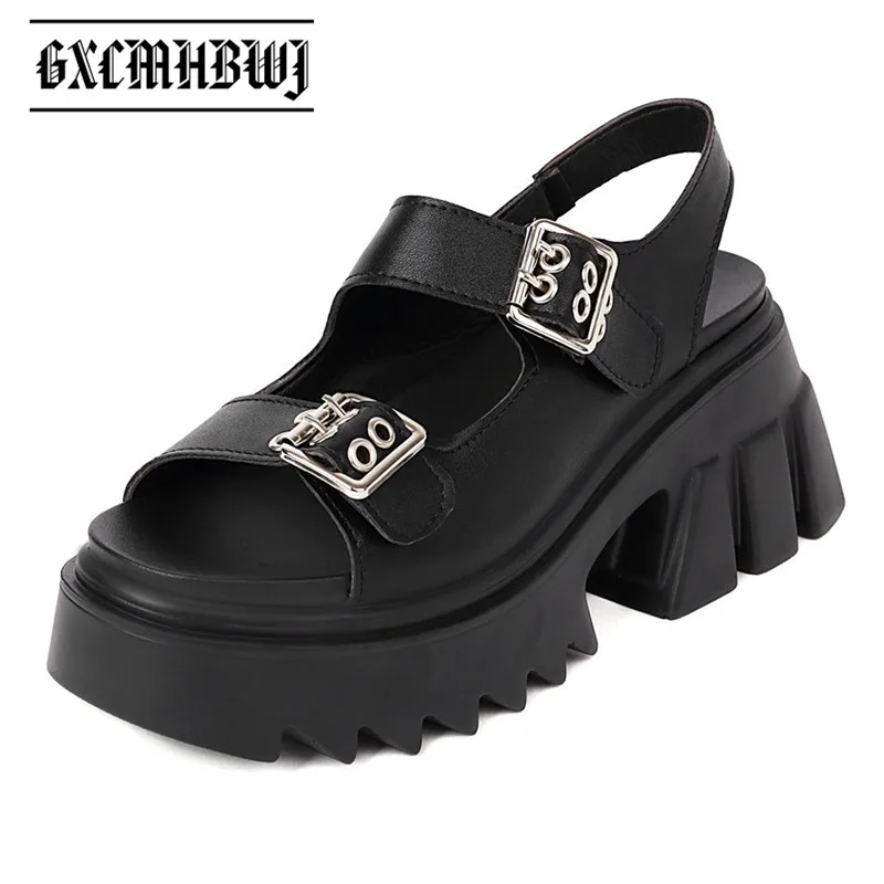 Black Platform Leather Slippers 2023 Newest Summer Solid Round Toe Fashion Plus Size Women's Outside Modern Elegant Shoes