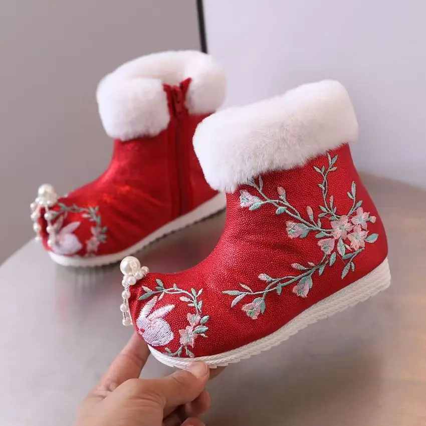 Winter Girls Embroidered High Top Cotton Boots Soft Sole Non Slip Plush Warm Ethnic Style Zippers Hanfu Boots Ankle Snow Boots