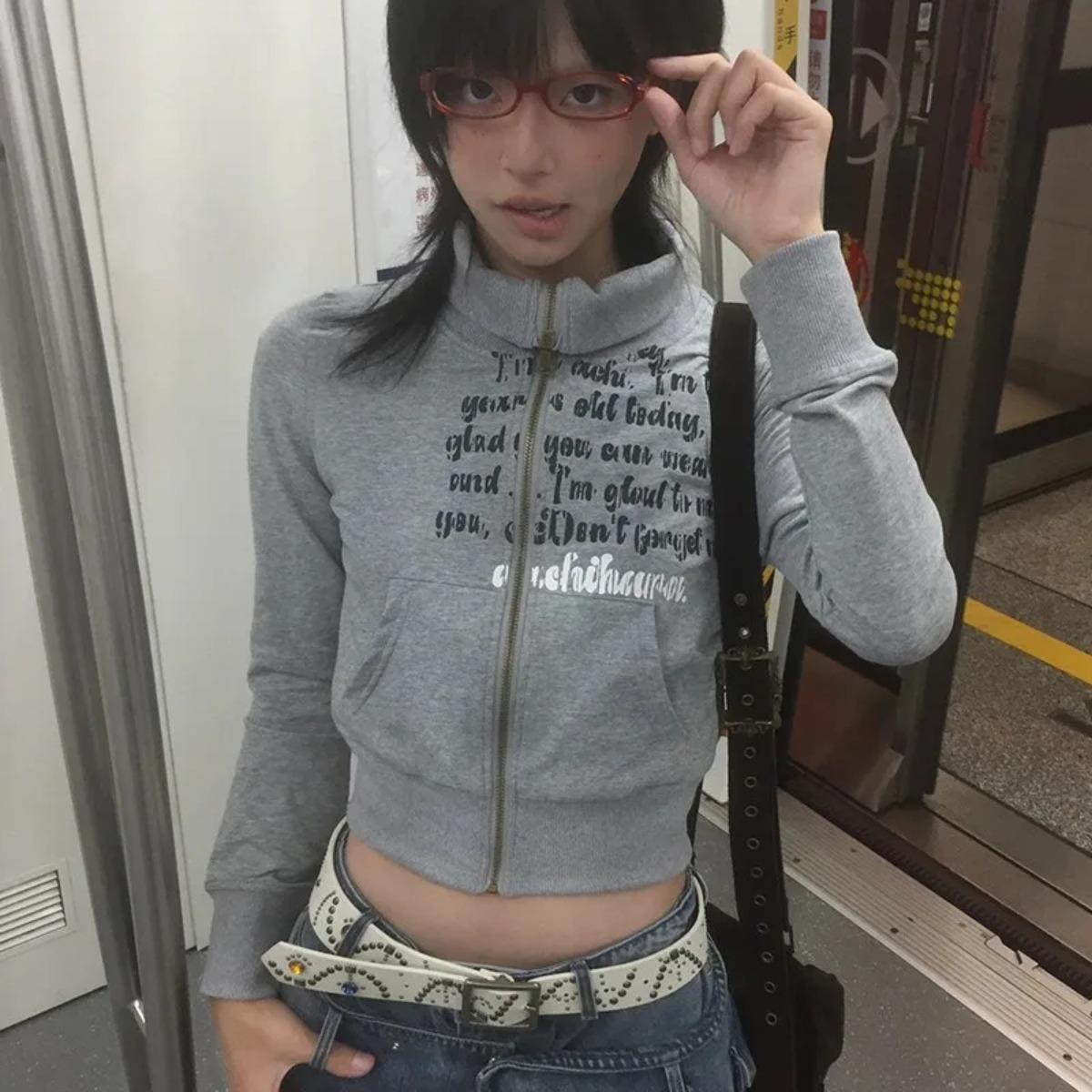2KWEIRD Японская укороченная куртка Y2k Винтажная Харадзюку Короткое пальто Американская ретро Принт с буквами Молния Толстовка Гранж Верхняя одежда L