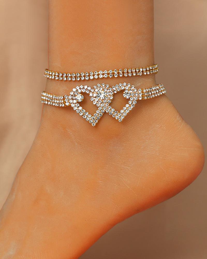 2PCS/Set Rhinestone Double Heart Stackable Anklets, Style1