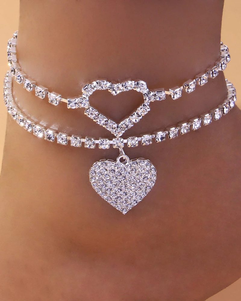 2PCS/Set Rhinestone Heart Chain Beach Anklet, Silver