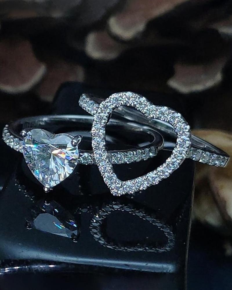 2PCS/Set Rhinestone Heart Shaped Couple Matching Rings, Silver
