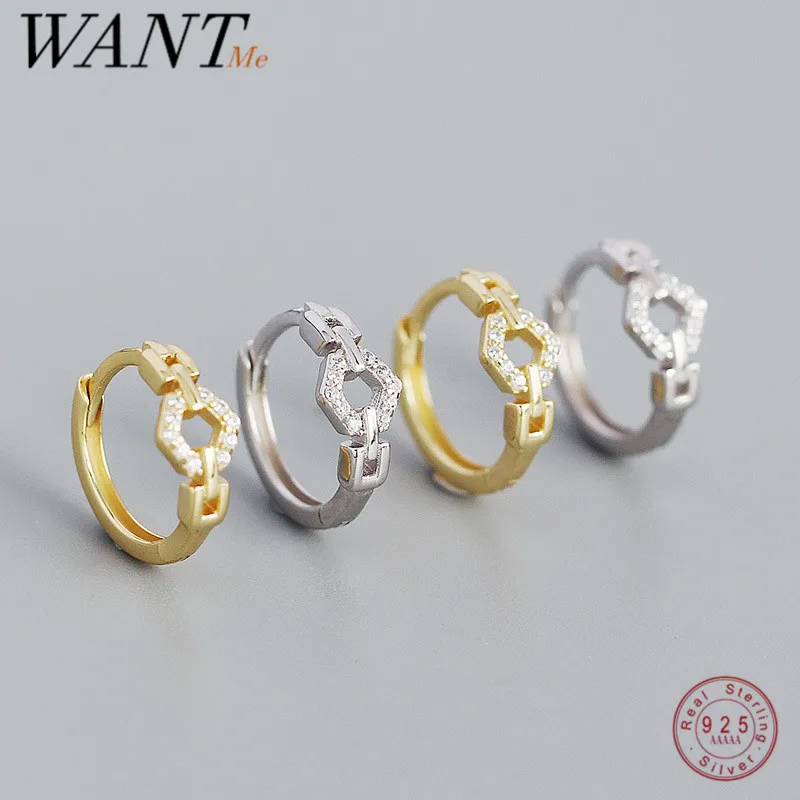 WANTME 925 Sterling Silver Punk Chain Shiny Zircon Huggies Ear Buckle for Women Hip Hop Gothic Charm Hoop Earrings Jewelry Gift