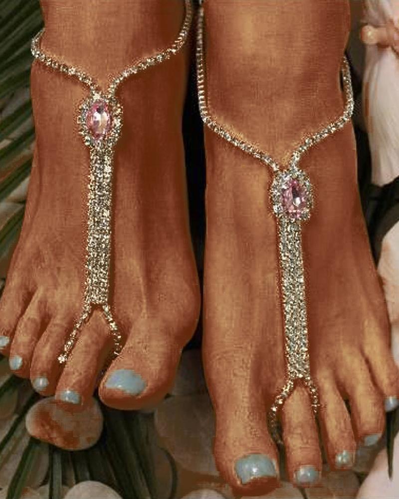2pcs Crystal Stone Rhinestone Fashion Jewelry Toe Ring Beach Anklets Set, Pink
