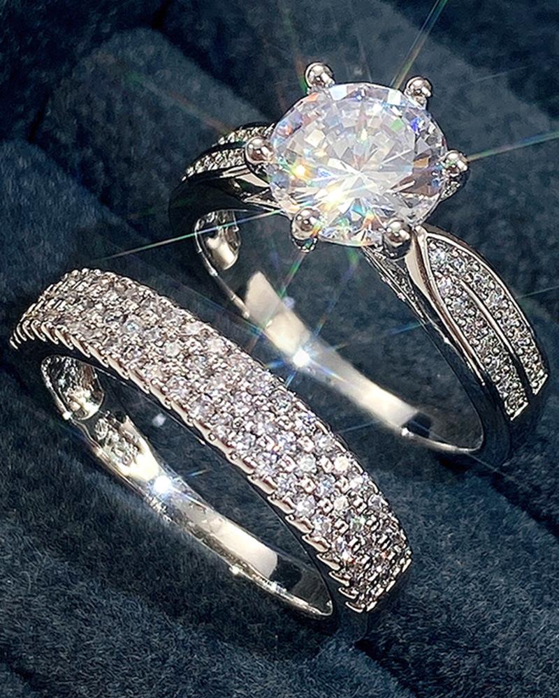 2pcs Geometric Rhinestone Round Cut Zircon Wedding Couple Rings Set, Silver