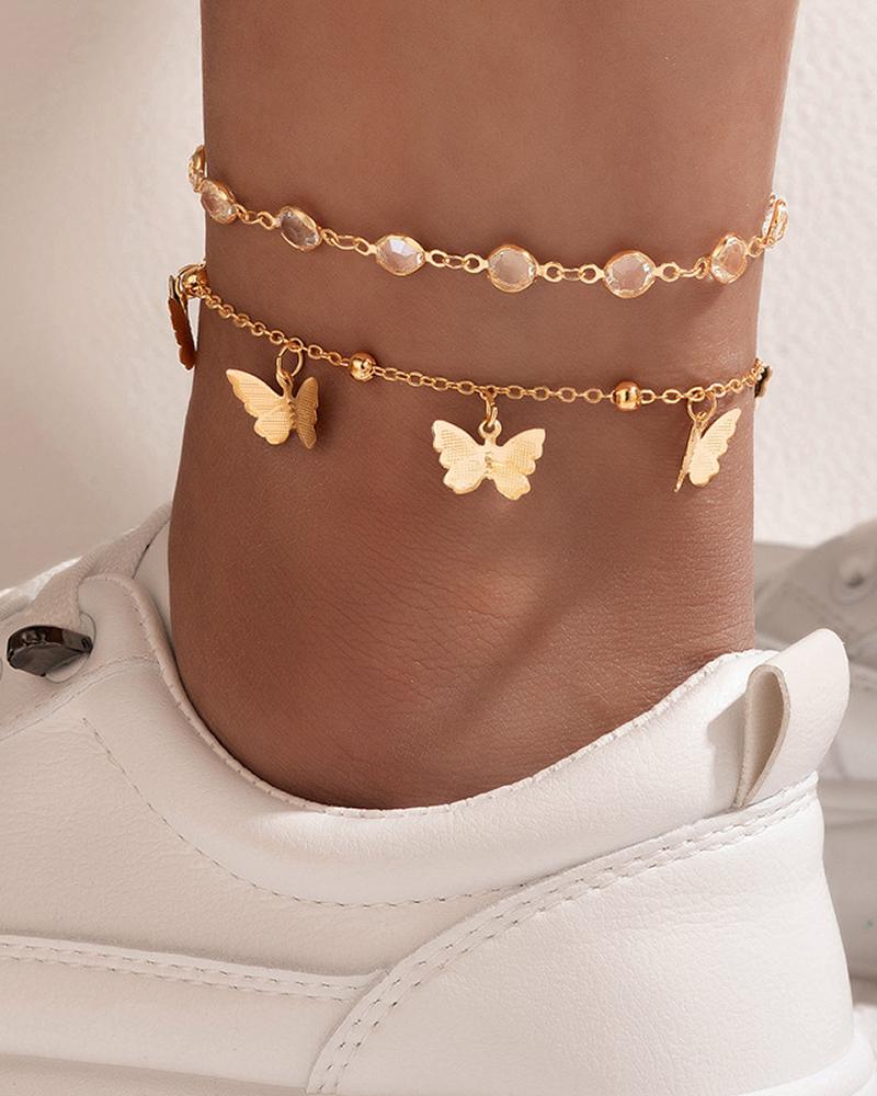 2pcs Layered Rhinestone Butterfly Pattern Chain Anklet, Style1