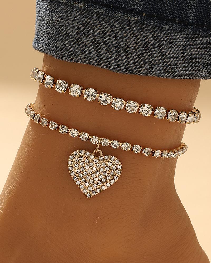 2pcs Rhinestone Heart Pattern Stackable Anklet Set, Gold