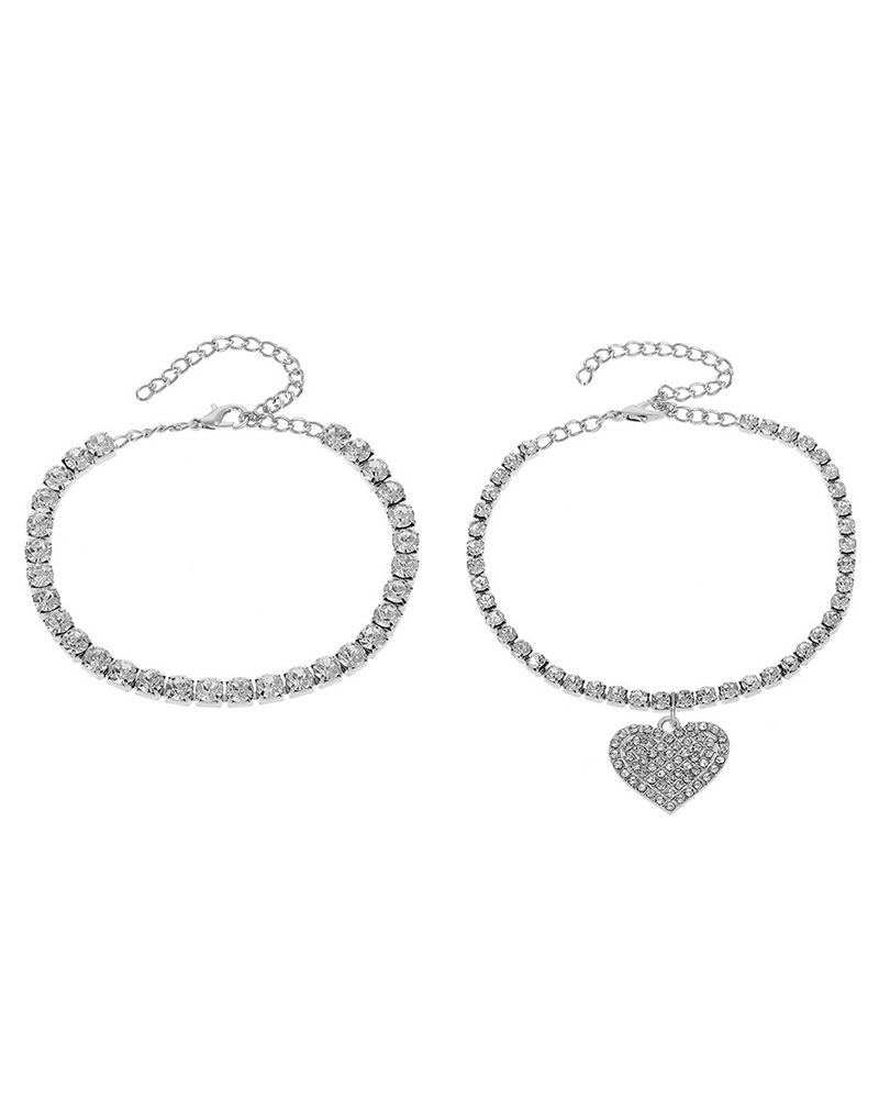 2pcs Rhinestone Heart Pattern Stackable Anklet Set, Silver