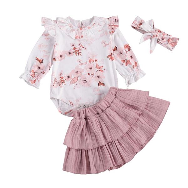 3шт детские девочки платье набор круглые шеи с длинным рукавом цветок печать falbala ползунок сплошной цвет плиссированный пузырь юбка лук п, White