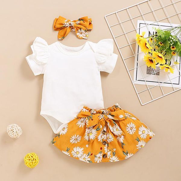 3шт летняя одежда набор младенческой новорожденных девочек цветочный принт взъерошенные ползунки цветок юбка оголовье летние костюмы наборы, White