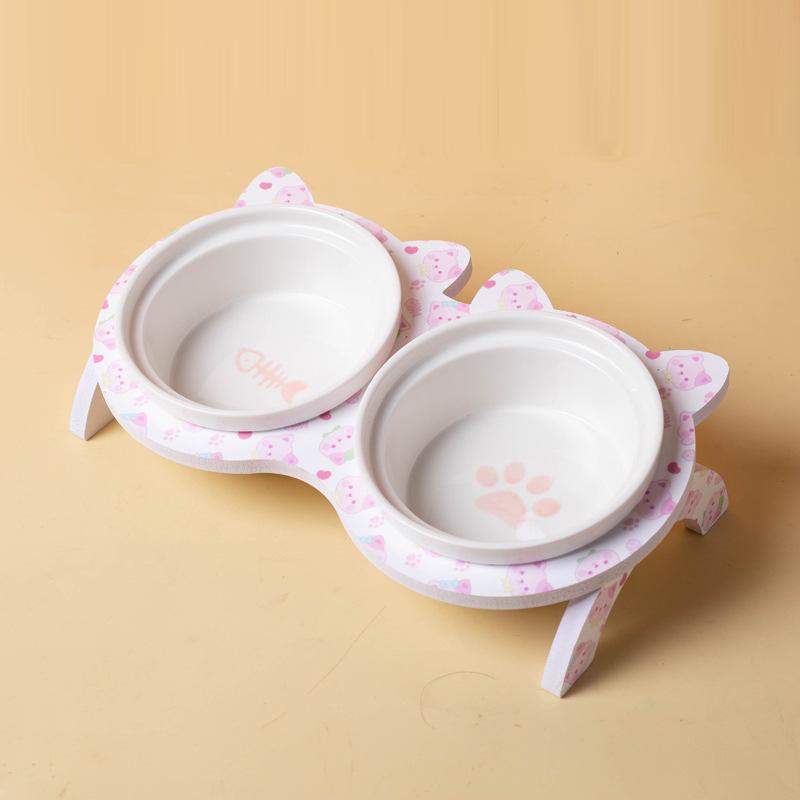 3шт / набор (1 шт. стойка + 2 шт. миска) Нескользящая керамическая двойная миска для корма для кошек и собак - Предотвращает проливания и скольжения розовый