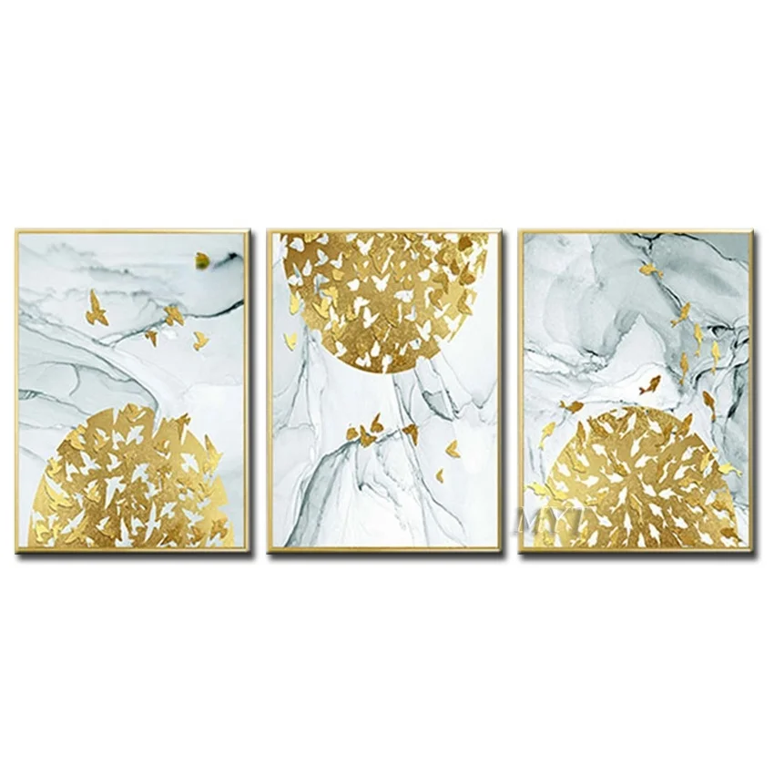 3 Панели с золотыми листьями, без рамки, ручная роспись, абстрактная Золотая масляная живопись на холсте, Настенный декор, искусство, 3 предме...