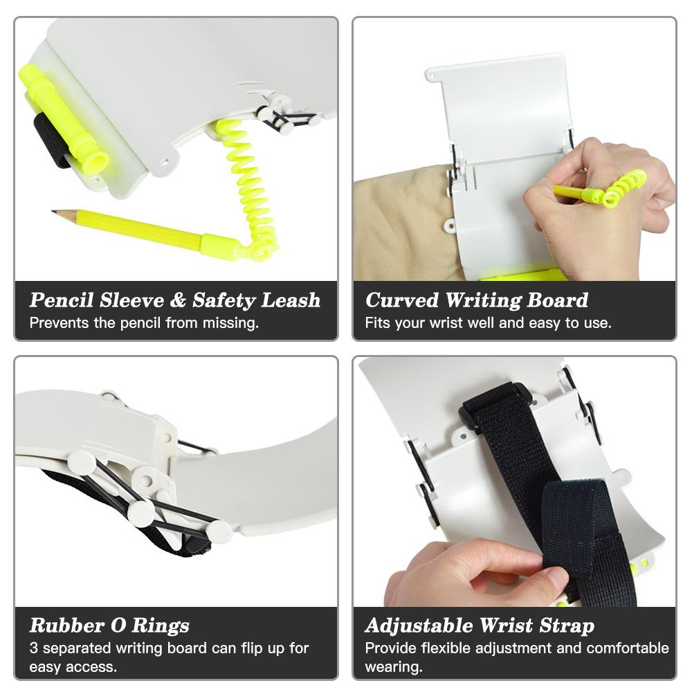 Характеристики: 3 отдельные письменные доски могут переворачиваться для легкого доступа. Защитный поводок для карандаша предотвращает его отсутствие. Регулируемый ремешок на запястье для удобного ношения. Приходите с дополнительным карандашом и уплотнительными кольцами 4шт. Технические характеристики: Материал: Пластик + нейлон Размер пишущей доски: 10,8 * 12,3 * 0,3 см ; 10,8 * 8,4 * 0,3 см ; 10,8 * 8,4 * 0,3 см Деменсион: 12,3 * 13,2 см / 4,8 * 5,2 дюйма Вес: приблизительно. 150 г / 0,3 фунта Список пакетов: 1 * 3-страничная письменная доска (с 1 карандашом и 4 уплотнительными кольцами) 1 * Запасной карандаш 4 * Запасное кольцо O