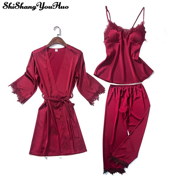 3 шт женщины пижамы наборы с брюками сексуальная пижама атлас сплошной цвет пижамы шелковый пеньюар пижамы халат платье наборы спортивный ко, Black;red