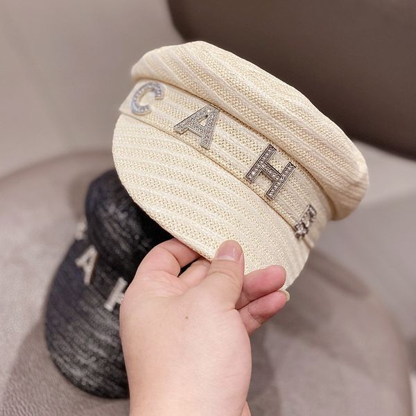 female all-match diamond letter beret summer straw flat beret straw hat hat navy cap, Blue;gray