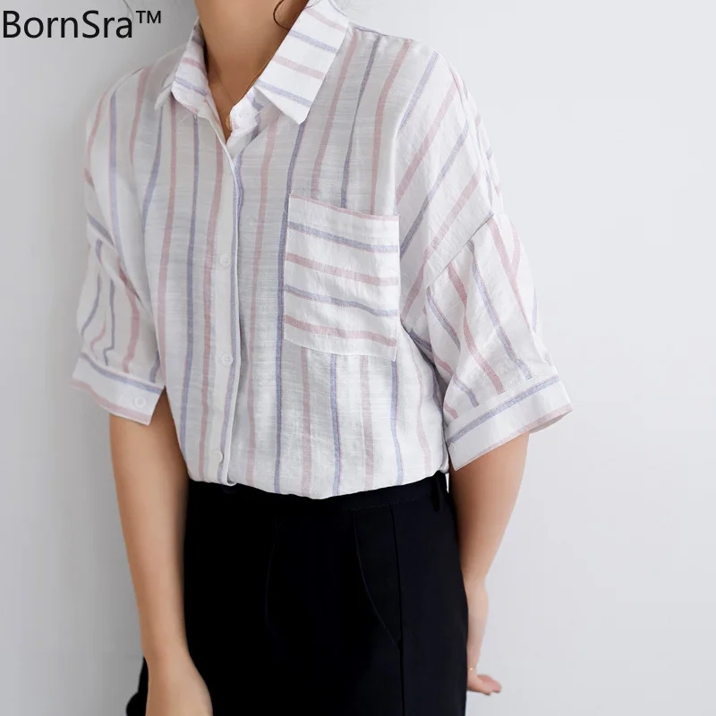 Bornsra 2020 Summer Striped Shirt Female Loose Slim Half Sleeve Shirts Regular Stand Office Lady Korean Womens Tops and Blouses