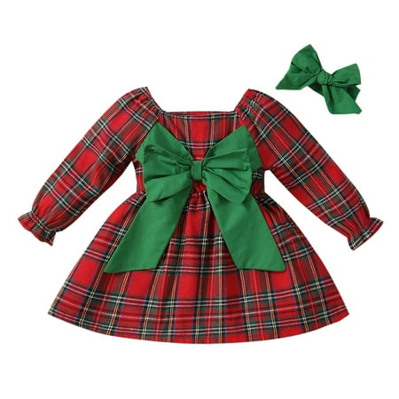 Toddler Girls Long Sleeve Bowknot Plaid Prints Dress Headbands Set Holiday Sweater for Girls
