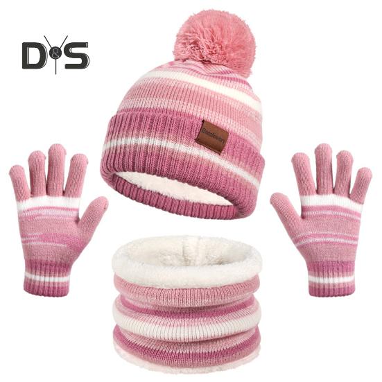 3 шт./комплект для детей, шапка, шарф, перчатки, утолщенный плюшевый мяч, декорированный в соответствии с цветом, вязаный, сохраняющий тепло, ветрозащитный, сохраняющий тепло, перчатки для улицы для девочек и мальчиков розовый