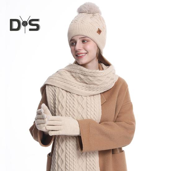 3 шт./компл. Зимняя шапка, шарф, перчатки, комплект для женщин, плюшевая шапка-бини, декорированная мячом, вязаный длинный шарф, перчатки для сенсорного экрана, комплект с плюшевой подкладкой и текстурой с переплетением, теплый комплект бежевый