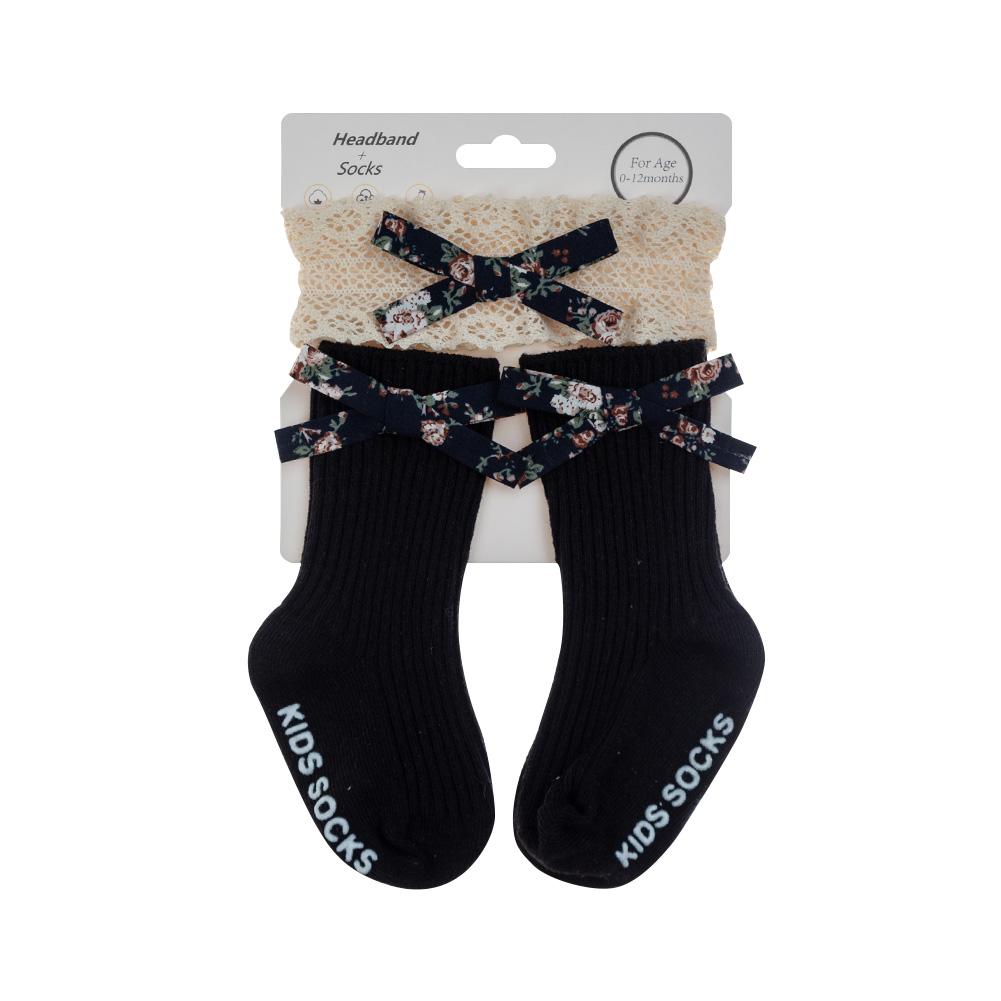 3 шт./лот Носки детские с цветочным принтом и бантом, нескользящие, для младенцев 0-12 месяцев, эластичные, принцесса, для мальчиков и девочек, длинные носки до колена, кружевная повязка на голову, детская резинка для волос