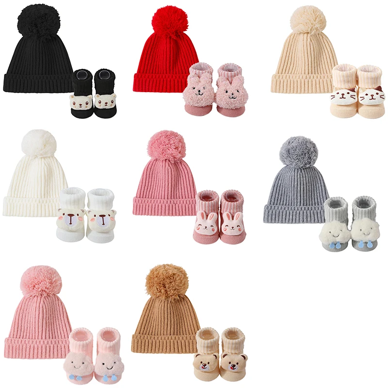3 шт., шапка-бини для маленьких девочек, комплект детских носков с героями мультфильмов, ветрозащитная осенне-зимняя детская меховая шапка с шариками, вязаные теплые детские шапки-ушанки для девочек