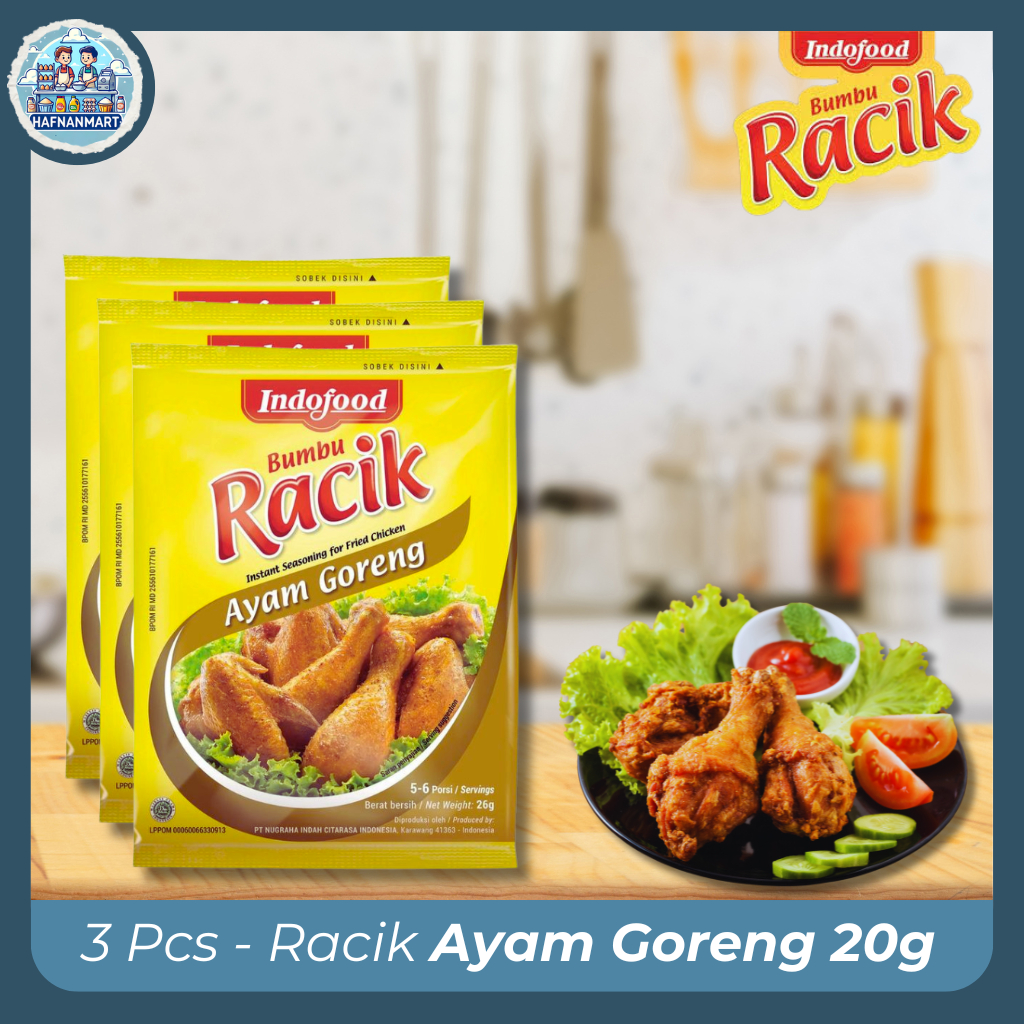Indofood Racik Ayam Goreng adalah bumbu siap saji untuk memarinasi ayam sebelum digoreng atau dimasak menjadi santapan lainnya. Bumbu ini berbahan dasar bawang merah, gula, garam, minyak nabati, bawang putih, daun serai, serta daun salam yang diproses secara higienis. Indofood Racik Ayam Goreng menghasilkan cita rasa yang nikmat sesuai dengan lidah orang Indonesia.