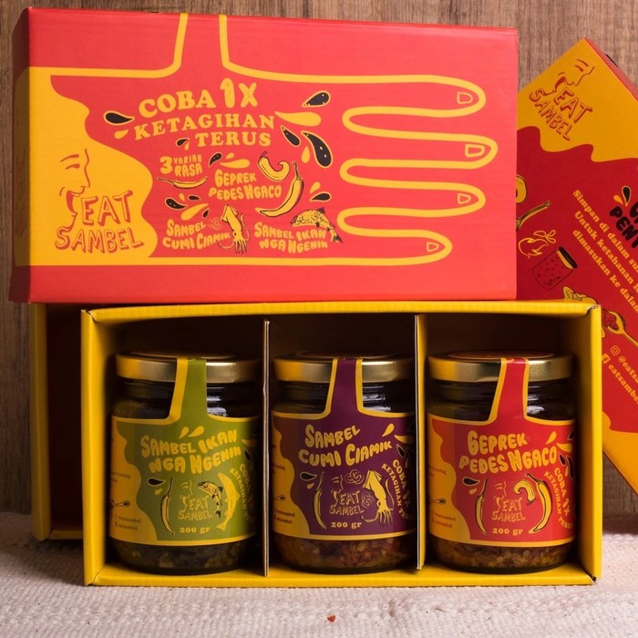 Set Sambel Jagoan ini terdiri dari 3 varian Eatsambel yang masing-masing rasa mempunyai ciri khas dan rasa tersendiri. Selain bisa menjadi teman makan seru Kamu. Masalah aroma dan pedas sudah menjadi andalan untuk si para Jagoan. Jagoan selalu bikin kamu teriak “PEDESNYA NGACO”. Kamu juga bisa memberikan 3 Sambel jagoan yang Super Enak ini untuk teman atau kerabat kamu, karena khusus untuk paket ini, kami lengkapi dengan packaging keren agar bisa dijadikan sebagai hadiah untuk teman maupun keluarga kalian.