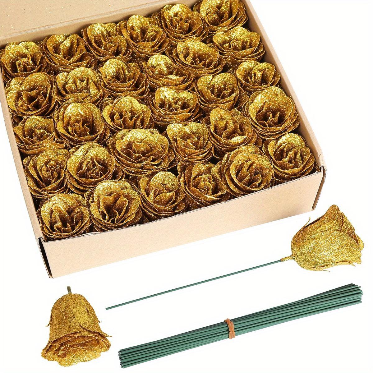 30 шт. искусственных золотых роз, блестящие розы на День святого Валентина, золотые цветы, искусственные розы со стеблями для поделок, свадебных букетов, вечеринок, домашнего декора золотой