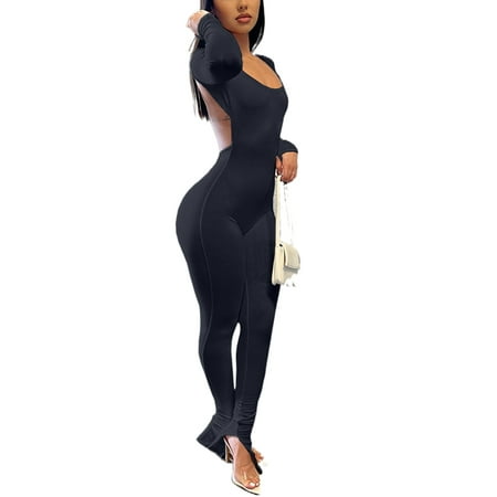 Ma&Baby Women Long Sleeve Jumpsuit Square Neck Backless Playsuit Rompers One-piece Bodysuits